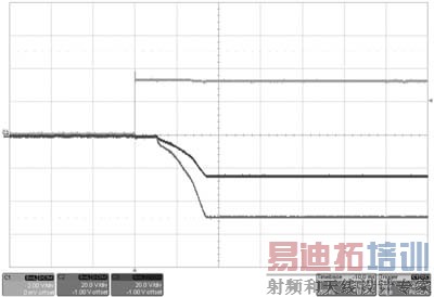 图3显示了3.3V输入应用之后的输出电压。由于-48V输出跟踪在大约两倍调节电压上,因此-24V输出上升至稳压状态。一旦处于稳压状态时,-24V输出就随负载发生少许变化。