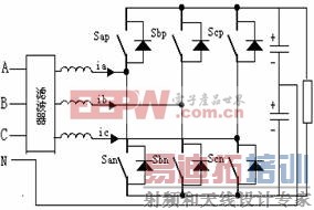 单相PFC组合成三相PFC的技术优势是:可以利用比较成熟的单相PFC技术,而且电路由3个单相PFC同时供电,如果某一相出现故障,其余两相仍能继续向负载供电,电路具有冗余特性。为了说明三相六管Boost型PFC电路的工作原理,给出其A相等效电路,如图2所示,电路为半桥Boost结构,若电感电流为正,即输入电压为正半周,则当下桥臂San导通时,相电压加上电容C2的电压对电感充电,输入电流上升;当上桥臂Sap导通时,电感电流通过二极管D1续流,电容C1上的电压和输入电压的差值使电感电流下降;若电感电流为负,即输入电压为负半周时,则当上桥臂Sap导通时,相电压绝对值加上电容C1的电压对电感充电,输入电流上升;当下桥臂San导通时,电感电流通过二极管D2续流,电容C2上的电压和输入电压的差值使电感电流下降;通过对San和Sap的适当控制,可以控制输入电流按给定的参考电流变化,从而实现功率因数校正。B相和C相的工作原理和A相类似。由于三相通过物理解耦,各相电流同时独立控制,可实现较理想的控制性能。该结构的优点是在任意时刻,每相只有一个器件导通,导通损耗低;控制上相互独立,相间干扰小,有利于提高系统性能和可靠性。