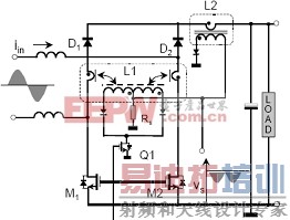 图4为文献[4]中提出的一种较复杂的电流互感器检测电路来还原电感电流信号。但是由于二极管的导通压降,使整流后波形的幅值减小,且过零点处波形严重失真,这将使PFC电流在过零出严重畸变,降低PF值,且采样电路比较复杂。