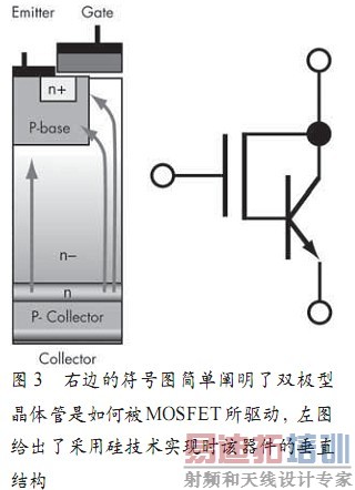 图3 右边的符号图简单阐明了双极型晶体管是如何被MOSFET所驱动,左图给出了采用硅技术实现时该器件的垂直结构