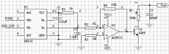 6N135最主要的特点是高速度,+=0.5(RL=1.9k)所以在高速数字通讯接口的隔离上更能显示和充分发挥其高速度的优良特性,数据的波特率可达500 k以上。相比之下,常见的光电藕合器件4N25和TIL117只能做到几千的波特率。图2右边所示的是/6N136用于DSP输出脉冲与主电路的连接电路原理图。在许多主一从结构的工业测控系统中,为了防止上、下位机的相互干扰,采用光电隔离器件是一种简单而有效的方法,采用6N135则可以不降低通讯波特率而实现子系统之间的隔离。