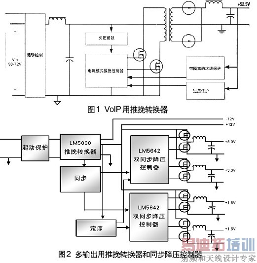 VoIP系统的最好方案是推挽转换器。推挽转换器基本上是等效于两个交错正激转换器。但推挽转换器只有一个变压器(是自重新调整)和一个输出电感器,使得它比单个正激转换器稍微复杂。由于交错效应使输入纹波电流大大降低,所以,可以用较小的输入电感器。输出电感器衰减输出纹波电流,使它可以用比较便宜的较低纹波电流额定值的电容器。级联电路馈入推挽拓扑结构也可用于提供更佳效率,特别是在输入电压范围极值情况下。对于较高功率和需要高效率的应用,用这种混合拓扑结构是一种良好的选择。