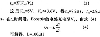 本文中的蓄电池采用三节1.2V串联给Boost电路供电为3.6V。为了满足PC机的可靠供电,设定电感L上的电流纹波必须为PC机允许范围内,这里取纹波为50mA,则I(peak-peak)=100mA。由f=100KHz,则T=10μs,由升压斩波电路输出输入电压与开关管通断时间的关系如式(3)。