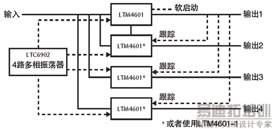 图2显示了一个采用LTM4601、在4层印刷电路板上设计的4输出103W微型模块DC/DC系统。该解决方案用8V至16V的中间总线输入提供1.5V/12A、1.8V/12A、2.5V/12A和3.3V/10A四个输出。这个设计的简化方框图如图3所示。4个LTM4601单元的相位锁定至4输出、4相振荡器LTC6902,该振荡器产生以90o交错的时钟信号,以降低噪声和纹波。
