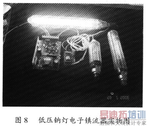 实验用了一节12V的蓄电池供电,经DC/DC升压电路将12V升到稳定的360V,实验用低压钠灯型号为PHLIPS公司的55W BY22d,数字存储示波器型号为DS-5000系列。研制的具有商品化的太阳能低压钠灯电子镇流器如图8所示,由于低压钠灯应用于街道照明引线不能太长,采用了前极升压电路与后极高频镇流电路分开没计的方案。