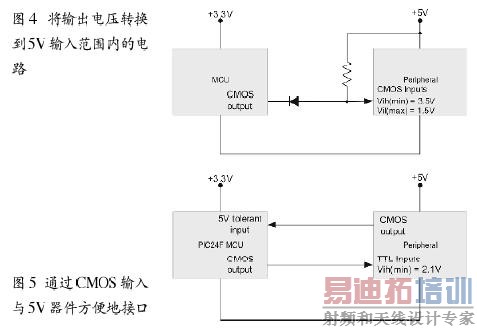 3.3V器件的VOH 电平一般比5V CMOS器件的VIH(0.7Vdd = 3.5V)稍低。一种简单的解决方案是使用二极管来实现电压转换。