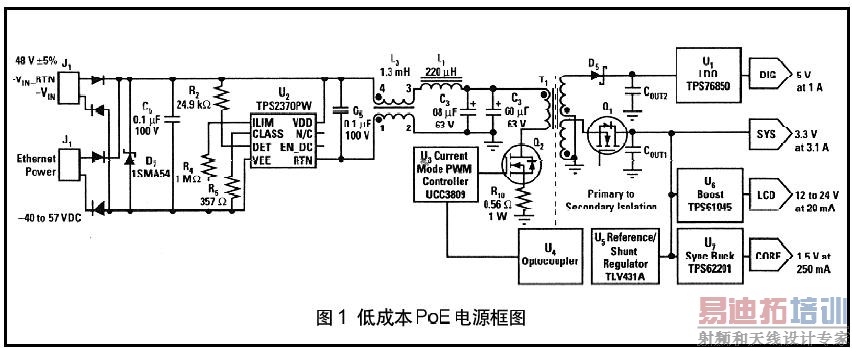 本文所描述的隔离电源能经Ethernet缆线为PD工作提供系统电压。电源由下列部分组成:PoE控制器,EMI滤波器,隔离电源变换器和第二变换器。尽管此电源是专门为VoIP电话设计时,但其特性是通用的,并可容易适用于其他PoE应用,此电源的主要设计目标是:低成本、小尺寸、高效率和符合IEEE802.3af标准。此电源的完整电路示于图1。