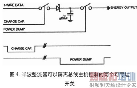 图4示出图2的半波整流器,隔离总线主机控制的两个可寻址开关。当输入开关闭合时,电容器通过DATA线接收电荷。充电时间间隔的长短是有效电源电流和所选电容值的函数。这种配置的最大优点是:在打开开关时,电容器及其电荷与网络隔离,而正常通信的恢复不会有漏电或C1容性负载。同样重要的是:存储元件隔离和由总线主机控制电源周期性工作可避免电容器/负载失效导致网络损坏。若在CHARGE CAP开关闭合时,C1发生短路,则DS2406开关将在其附加电源消除时恢复失效开路状态,自动从主总线去除失效条件。当需要存储的电量时,输出POWER DUMP开关闭合而电容器通过负载放电。此结构的重要元件从总线主机到存储元件的能量传输是低电平,而能量的使用是在高能量脉冲下。