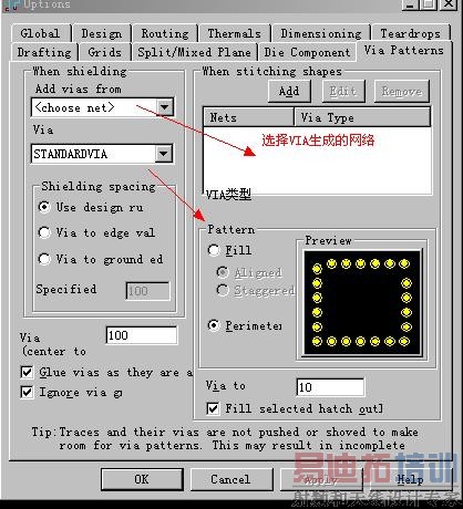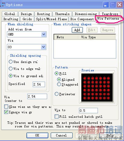 此选的网络为我铺铜的网络(GND)其实此项功能主要是用来防干扰的,继续看下去就知道了其它的自己试试就知道了,三:再回到画板介面选择你要增加"VIA PATTERNS"的网络右击出现add via shield 后出现如图还有其它的设置自己试试也就知道了...如有不懂的请加395324275