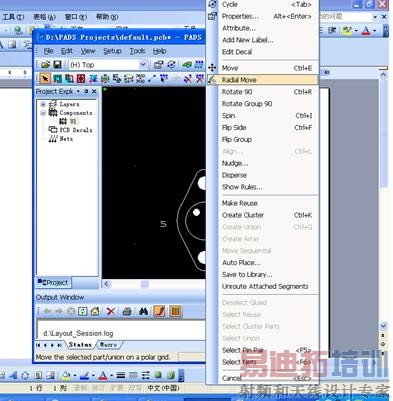 PADS layout选中要旋转的元件---单击右键弹出菜单----点Radial Move后按极坐标轨迹移动即可(每移动一下15度)。如图