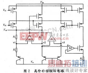 从而在Q2,Q3的VBE之间产生一个差值Tln T项。这个差值项通过运放gm1,gm2被引入到IR1中来修正VBE,Q1中的高阶项。