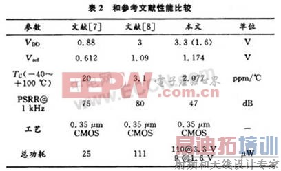 表2为本文设计电路与文献[6]和文献[7]中电路的模拟仿真结果比较。本文电路的供电电压可以低至1.6 V,输出电压1.174 V.在-40~100℃时温漂约为2ppm/℃,且功耗最高不超过110 μW。由此可见,本文设计电路具有低电压低功耗和低温漂的优点,综合性能优异。