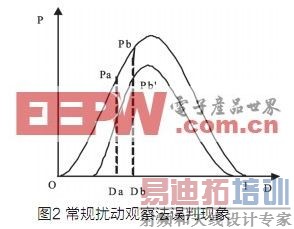 此外,当外部环境快速变化时,常规扰动观察法不能快速跟踪,很容易造成误判现象。例如,当太阳阵已经工作在最大功率附近,假设此时对应的占空比为Da,对应输出功率为Pa(图2),当占空比扰动方向向右移动时,若日照强度没有发生变化,则太阳阵输出功率Pb>Pa,占空比扰动方向正确。但倘若光照强度突然降低时,则对应Vb的输出功率Pb`