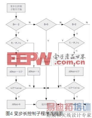 [p]变步长控制策略设计成一个子程序。首先根据三点比较法可以确定a、b、c的大概位置(相对与最大功率点而言),然后设定一个系统可以接受的最小占空比变化率(假设此值为min a),下面以三点在最大功率点左边来阐述变步长控制策略。刚开始时,控制系统以一个较大步长的占空比变化率来调整。假设某一时刻系统占空比为D(n),如果Pc-Pb≥e(e为一个很小的正数),则保持原来的占空比变化方向和步长变化率λ;如果0≤Pc-Pb