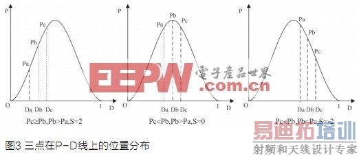 首先在太阳阵的P-D曲线不同位置,从左向右任意取三点a、b、c,对应的输出功率和占空比分别为Pa、Pb、Pc和Da、Db、Dc(图3)。先引入一个符号变量S,对于a、b两点,若Pa≥Pb,则S=-1,否则S=1;对于b、c两点,若Pc≥Pb,则S=1,否则S=-1。这样,以b点占空比Db为基准,Da=Db-l,Dc=Db+l。每一个采样周期里,比较三点计算所得功率的大小,进而得到符号变量S的值,根据S决定占空比移动方向。
