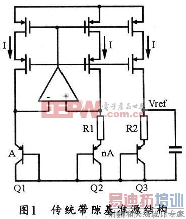 传统带隙基准电压源的工作原理是利用两个温度系数相抵消来产生一个零温度系数的直流电压。图1所示是传统的带隙基准电压源的核心部分的结构。其中双极型晶体管Q2的面积是Q1的n倍。