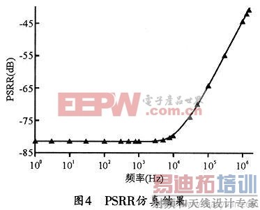 图4所示是本设计的PSRR仿真结果。从图4可以看出,在低频时,其PSRR约为-81 dB。