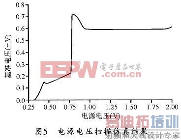 图5是本设计的电源电压扫描仿真结果。由图可见,其电源电压在1~1.8 V之间,基准电路都能很稳定的输出约600 mV的电压基准值。