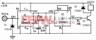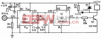 这个电路是使用,CMOS集成电路CD4013双D正反器,分别接成一个单稳态电路和一个双稳态电路。单稳态电路的作用是对触摸信号进行脉波宽度整形,保证每次触摸动作都可靠。双稳态电路用来驱动晶体管Q1的开通或关闭,进而控制继电器。