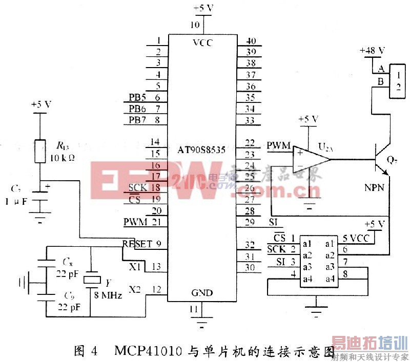 图4即为在止鼾器的恒流源电路中MCP41010与单片机AT90S8535的连接图。图4中运放U2A、三极管Q7以及MCP41010构成了恒流源电路。A,B两点是刺激电极接到人体中。此电路可以为不同人体提供恒流。MCP41010代替了机械电阻,它的PW0端与PA0端短接接地,PB0端接到横流电路中,通过它可以改变恒流的大小,增加或减小刺激人体的电流。