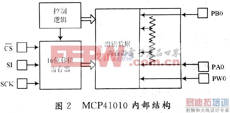 MCP41010的内部结构如图2所示,从图2中可以看出,此芯片内含有:SPI总线接口、一个POT(电位器)。POT内有一个8 b滑刷控制数据寄存器。