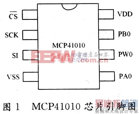 MCP41010是Microchip公司生产的一种集成数字电位器。它在单一芯片上集成一个10 kΩ数字电位器,电位器的滑动端共有256个离散的调节节点,并有一个8 b的E2PROM数据寄存器,直接控制滑刷在电位器上滑动端的位置。用户可以通过相应指令往数据寄存器写8位字,调节精度可达256。MCP41010芯片具有工业标准的SPI同步串口,可以实现寄存器操作,从而改变滑刷的位置。