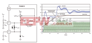 任何电源设计都要优先考虑启动,PFC转换器也不例外。对大多数PFC应用而言,稳压输出电压设置点在400V 范围之内,故只要有任何电压过冲,尤其是在软启动期间,就会对输出大电容和开关组件造成额外的应力。FAN9612能够解决与启动有关的两大重要问题。第一是能够在整个启动程序期间保持闭环软启动。图1所示为FAN9612专有软启动电路的功能实现及启动程序仿真。