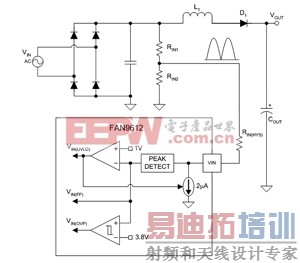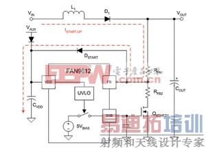 除了闭环软启动工作模式之外,FAN9612还具有通过VOUT电阻分压器网络直接启动的可选功能。对于没有足够的辅助偏置电源电压或待机电源的应用,启动任何高电压IC都必须对VDD电容进行充电,直到电压达到控制IC欠压锁定(UVLO)导通阈值为止。这一般需要额外的电路,因而会增加功耗及降低效率。有些设计人员会采用这种方法:当通过自举偏置(bootstrap bia)电源对PFC控制IC进行供电时,关断启动电路。虽然这种方案有助于降低功耗,但往往需要高侧开关和驱动电路,从而增加外部组件的数目。FAN9612经特别设计,无须外部启动电阻即可启动。在FB和VDD之间增加一个小信号二极管DSTART即可提供一条经过RFB1的电流路径,见图2中的红色虚线。一旦内部5V参考电压有输出,小信号MOSFET QSTART就被开通,电阻反馈网络即从启动功能中解脱出来。另外也可以根据情况,忽略DSTART和QSTART,采用传统的启动方法。
