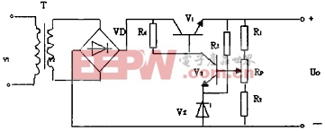图2是一种串联型稳压电路,由取样电路、基准电路、比较放大和调整电路等部分组成。其中R1、R2和RP组成取样电路,R1、R2和RP称为取样电阻;R3和V2组成基准电路,R3是VZ的限流电阻,VZ给V2发射极提供一个基准电压;V2为比较放大管,作用是将稳压电路输出电压的变化量先放大,然后再送到调整管基极;V1是调整管,起调整作用。 稳压过程如下:当输出电压U0发生变化时,通过取样电路把U0的变化量取样加到放大管V2的基极。而由R3和Vz组成的基准电路为V2的发射极提供基准电压Uz。由V2和R4组成的放大电路把取样电压和基准电压进行比较放大后,输出调整信号送到调整V1的基极,控制V1进行调整,以维持U0基本不变。