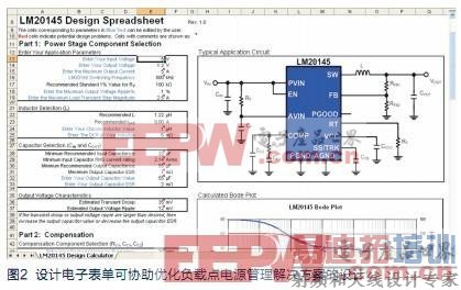 对于一些不擅长电源管理的设计人员来说,他们确实需要一些支持去优化电源的设计。例如,仿真工具可协助展现电源系统的实际特性,但由于仿真工具一般都不能够直接地提供元件间的折衷建议。由此,比仿真能力更重要的设计支持是要协助设计人员找出最合适的外置元件。LM20000稳压器系列可提供一个Excel格式的设计指导,可帮助设计人员迅速地挑选出最合适的外置元件并可计算出其可预测的稳定性。图2表示出由美国国家半导体设计网站所提供的免费精简设计电子表单。