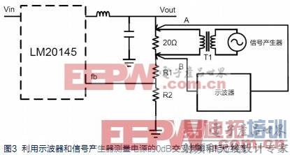 毫无疑问,检查电源设计稳定性的最佳方法是在实际环境中进行测量。测量的方法是采用一个普通的信号产生器和示波器去测量调节环路转换函数的0dB交叉频率及0dB交叉频率的相位裕度。图3所示为测量的设置。