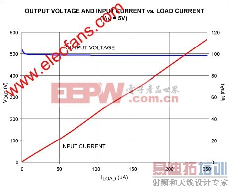 一个IC(MAX1605)包含必要的开关稳压器,调制器,误差放大器和电源开关。它推动了一个环形变压器,其中包括一个反馈绕组几个输出。随着元件值如图所示,该电路可产生500V的。你可以改变输出电压±通过调整电阻反馈分压器率30%。您还可以增加或减少输出电压中的步骤,通过添加或删除/电容/输出绕组模块(BAV21)整流器。输入电流和输出电压的变化如图所示,输入电压(图2)和负载电流(图3)。