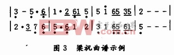 因此,可以所选曲谱的最短音符作为时值的度量单位。比如,图3所示的《梁祝》曲谱中最短的音符为8分音,若其编码存放1个存储单元,则时值计数脉冲周期为一个8分音长时间,可选O.5 s。曲谱中的四分音符码需要存放2个单元,一拍延长音也需要2个单元。该段曲谱有8个音节,每个音节是一个全音(8个8分音),演奏总时值为8×8个8分音。所以,存储曲谱编码的存储器需要64个存储单元。