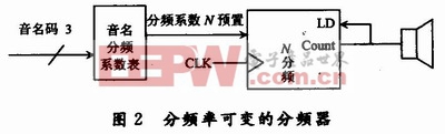 因此若采用模值和输入脉冲频率都可控的计数器实现信号分频,可根据音程码选择分频计数器的输入脉冲频率fs、根据音名码控制分频计数器的模值N,如图2所示。