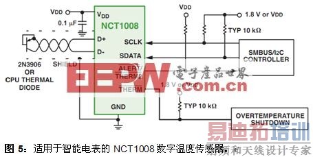 以NCT1008为例,这是一款精度达±1°C的双通道数字温度传感器,适合智能电表等应用。这器件具备串联电阻消减功能,能够根据温度测量结果自动消减与温度监测二极管串联的多达1.5 kΩ,从而帮助滤除噪声。这器件还提供可配置的警示(ALERT)输出,及可扩展、可转换的温度测量范围(从默认的0°C至+127°C扩展至-64°C至+191°C)。