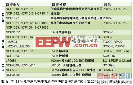 安森美半导体为智能电表电源/电源管理模块提供包括交流-直流(AC-DC)转换器/稳压器、直流-直流(DC-DC)开关稳压器/控制器和低压降(LDO)线性稳压器等多种选择(参见图3和表1),方便用户选择适合的电源方案。