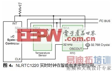 安森美半导体为智能电表应用提供多种时钟产品,包括PureEdge™系列晶体振荡器模块、零延迟缓冲器等。此外,安森美半导体还计划在2010年第4季度推出NLRTC1220实时时钟,可配合安森美半导体的NCT66温度传感器用于智能电表(参见图4)。