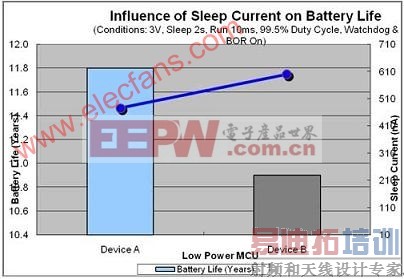 图1:MCU睡眠电流与电池寿命之间的关系。