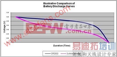 另一个重点是必须评估随着时间推移,设备电池电量的变化。所有的工程师都明白,一次电池随时间变化的电压在很大程度上是取决于电池的架构和负载。以CR2032为例,一对AA/AAA碱性电池便具有不同的放电模式,因此,一个设计良好的应用,必须能在不同的电池条件下都可以相同效能运作(图2) 。