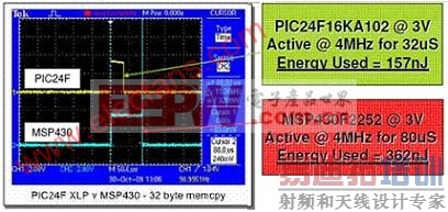 举例来说,若采用通用C函数memcpy()从一个内存地址将32字节的数据拷贝到另一个位置,并针对PIC24F和MSP430编译,那么,由此产生的程序代码需要比MSP430更多出790%的工作周期(316 vs. 40)。在3V和4MHz条件下,这个例子所消耗的能源比MSP430高出了230%。由此可见ISA的重要性。