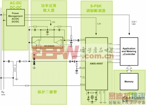 此外,AMIS-49587采用S-FSK调制技术,结合高分辨率的滤波算法,配以自动可信值/中继器(repeater)功能,提供基于长距离电力线的高可靠性数据通信。通信误差比其它可选及现有方案更低。这器件藉板载低抖动锁相环(PLL)与交流主电源(mains)信号同步。由于包含16位分辨率的模拟前端,使器件具有极优的噪声免疫性和极高的接收灵敏度。