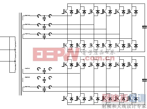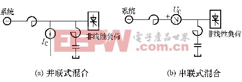 在并联式混合型补偿装置中,有源滤波器的主回路采用效率高、损耗小的电压源脉宽调制(PWM)逆变器,有源滤波器的作用主要是产生补偿谐波电流的电流IC,无源滤波器主要用于补偿无功,并兼顾补偿某指定次数的谐波。这样安排的优点是可以大大减小并联式有源滤波器的容量,便于并联式有源滤波器的应用。在串联式复(混)合型补偿装置中,有源滤波器的作用是产生补偿谐波电压的电压UC,使电源侧与非线性负荷之间实现谐波隔离。其优点是可大大减小串联式有源滤波器的容量,无源滤波器既可补偿无功又可补偿谐波。其缺陷是应用于高电压等级的串联式有源滤波器的安全隔离和保护,目前在技术方面仍存在一些困难,因而只能应用于一些低电压和小容量的场合[1]。因此本课题选用了适合于高电压等级大容量场合的并联式混合型有源滤波器装置的研制。