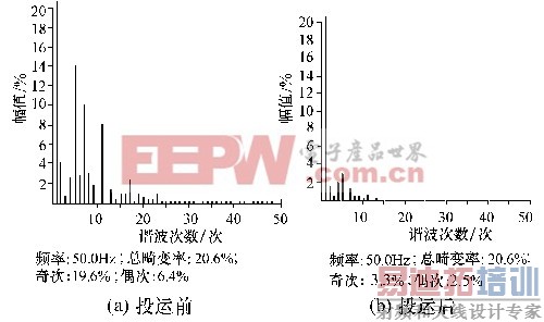 图3 补偿装置投运前后10kV侧线路电流的频谱分析
