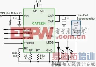 图3:业界首款单芯片4 A超级电容LED驱动器CAT3224应用电路图。