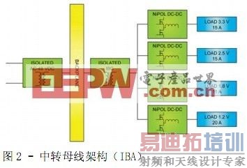 每个负载输出电压由与负载电流大小相应的隔离DC-DC 转换器供电。通常,这种方法的成本极高,所需的电路板面积也极大。但由于“串级”转换阶数较少,输入母线分布损耗较低,因此能够产生极高的整体效率。IBA 架构致力于减少电路板面积和DPA 架构的成本。这种方法将交流电转换为与 DPA相同的宽范围或窄范围的直流电。对于宽范围要求,采 用稳压或半稳压式、隔离母线转换器(IBC)将高电压降到窄范围非隔离点负载转换器(NiPOL )相对于占空比和效率而言的平均最佳点。每个NiPOL 工作在此母线电压下,并且产生每个负载所需的稳定输出电压。对于窄范围情况,为NiPOL 供电的隔离式 DC-DC 转换器可以是半稳压或甚至完全不稳压式。就 IBA 拓扑而言,窄范围的半稳压或完全不稳压式,具有极高的功率密度和效率;而对于宽范围的稳压或半稳压式,具有较低的效率和功率密度。在不稳压情况下,每个 NiPOL 的输入电压变化 1/K,K 是IBC 的降压比率。IBA 的优势是通过使用较小的 NiPOL 和一级隔离电源,将电源系统的整体尺寸和成本降至最低。小型 NiPOL 可以靠近点负载,顾名思义是得到更好的瞬态响应。与 DPA 相比,IBA 的每路电压有两级转换,分布损耗以中转母线电流的平方增加,因此它的缺点是系统整体效率较低。这种构架的效率很难做高,是因为中转母线电压比 DPA 拓扑低四倍以上,因此对于给定的输出功率产生更高的中转母线电流。此外,每个 NiPOL 的中转母线电压不会产生最佳的效率。