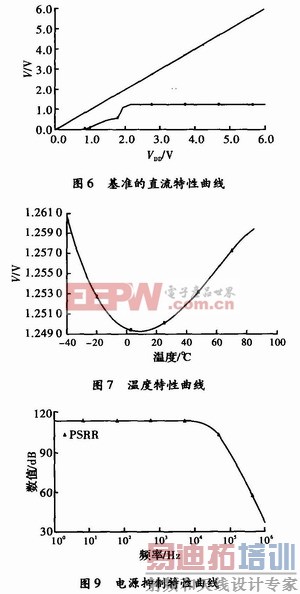 对设计的带隙基准电路进行了性能指标的仿真。使用HSPICE工具,基于Hynix 0.5μm CMOS工艺,仿真条件为25℃下全典型模型。从图6中基准的直流特性可见,电源电压在1.5~6V之间变化时,基准输出仍保持良好的稳定性;图7为基准的温度特性曲线,当温度从-40~100℃变化时,基准电压的变化仅为2.2 mV,温度系数为13.7×10-6/℃,显示了低温漂的特性;图8是基准环路稳定性的仿真曲线,基准的环路增益为110 dB,相位裕度为67°;图9是基准的电源抑制特性的仿真波形,低频时PSR为-117 dB。仿真结果都满足性能指标。