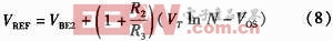 该电路的运放如图2所示,运放的主要作用是保证△VBE的精准性。然而运放的失调是一个主要的误差源。假设输入端的失调电压为VOS,经过计算可以得到