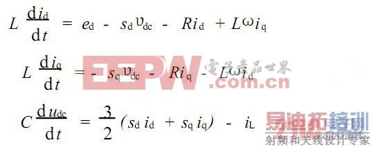 三相PWM整流器主电路如图(1) 所示, ea , eb , ec为电源电压, ua , ub , uc 为整流器整流侧输出电压,其中整流器交流侧输入电感L 起到滤波和升高直流电压的作用,直流侧电容C 作为储能元件并起到稳压作用。三相PWM 整流器在d2q 坐标系下的数学模型为: