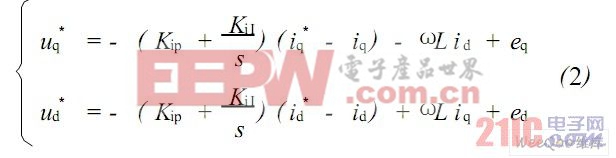 从式(1) 数学模型看出, d-q 轴变量相互耦合,不但电压无法进行单独控制,而且给控制器的设计带来一定的困难。为此,引入id 、iq 的前馈解耦控制,对ud 、uq 进行前馈补偿,得到电流控制的两相旋转坐标系下电压指令为式(2) 。前馈解耦控制框图如图3 所示。