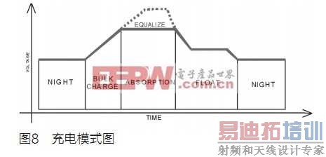 在充电过程中,如果充电电流大于系统设定的最大允许充电电流值(一般为电池容量的0.1倍),此时无需进入MPPT工作状态,控制系统限制充电电流在最大充电电流值以下;只要充电电流小于最大允许充电电流值,就立即进入MPPT充电模式充电,以获取最大的光伏能量。 在充电过程中按照下图充电曲线所示电压值实时监测电池电压,并限制最大充电电压,最大充电电压值由充电电池的特征决定,同时考虑到温度对电池的影响,在一般情况下,铅酸电池以25℃为参考点,单体电池按照-3mv/℃进行温度补偿。这样即能在寒冷的冬天保证电池充满,又能在炎热的夏天有效防止电池充爆。具体的充电时序图8所示。
